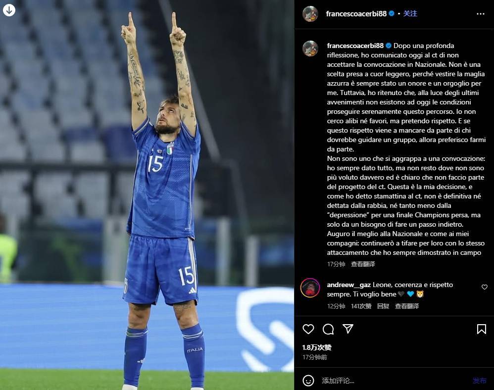 “经过深思熟虑,我今天已告知国家队主教练,不接受征召。这不是一个轻率做出的决定,因为穿上蓝色战袍对我来说始终是一种荣誉和骄傲。然而,我认为,鉴于近期发生的事件,如今已不存在平静继续这段旅程的条件。我不寻求借口,也不寻求优待,但我要求尊重。而如果这份尊重在理应领导团队的人那里缺失了,那我宁愿选择退出。